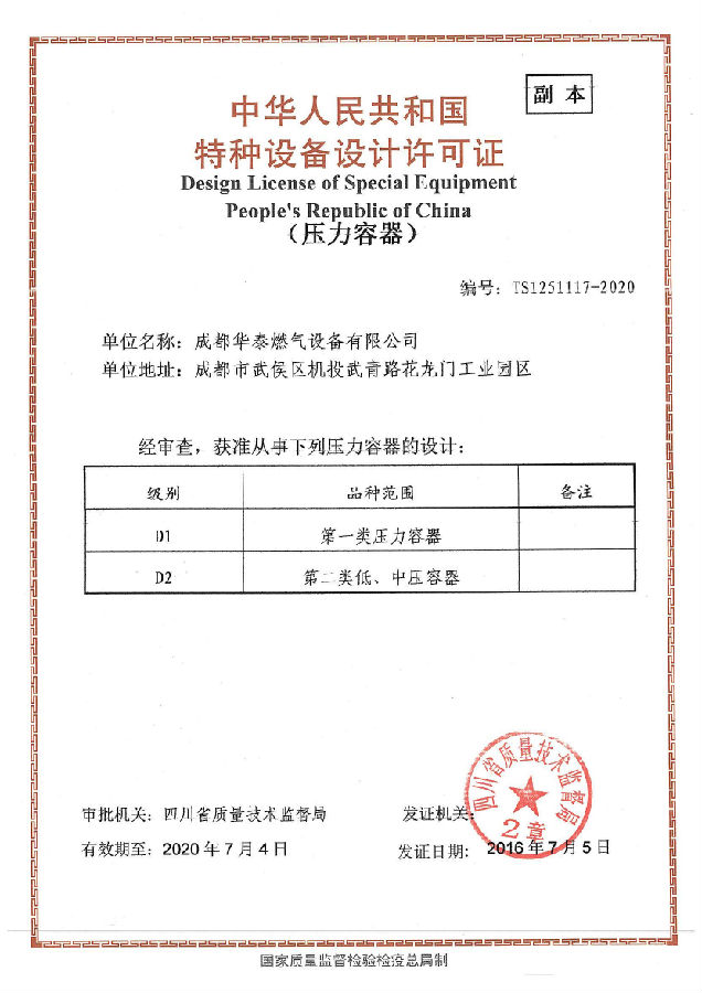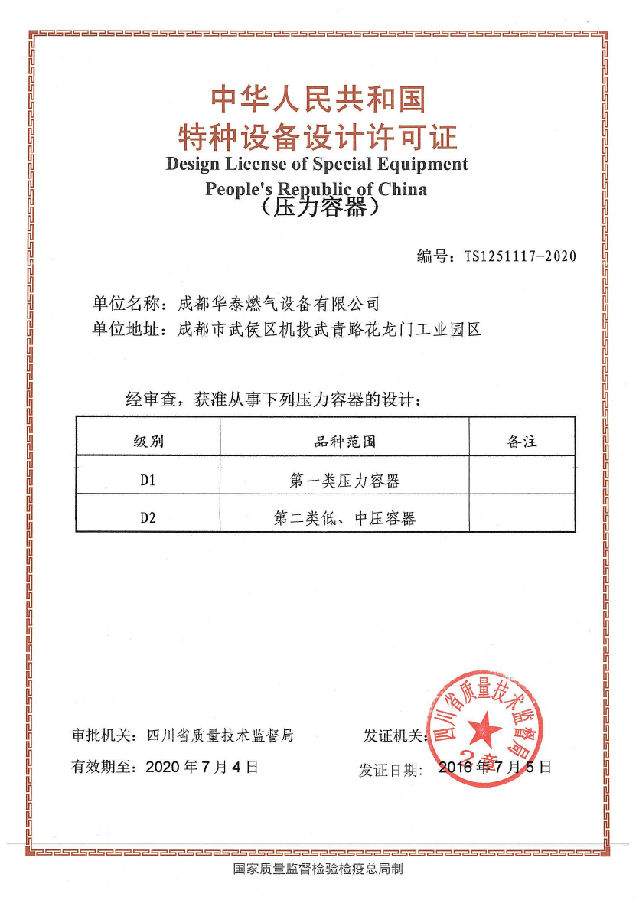 热烈祝贺华泰燃气获得了中华人民共和国特种设备设计许可证(压力容器)!