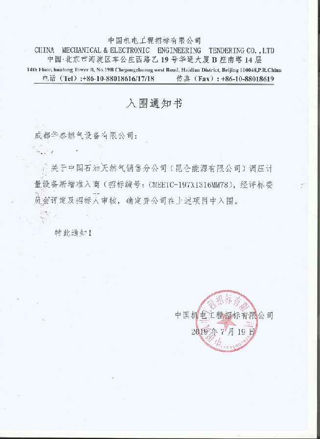 热烈祝贺我公司入围昆仑能源有限公司(2019年调压计量新增准入商)
