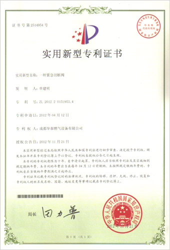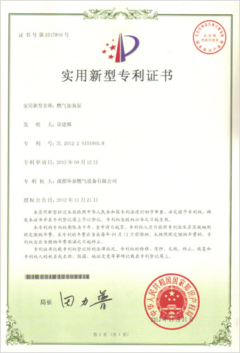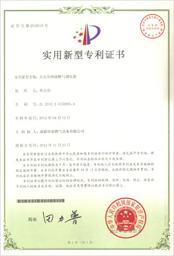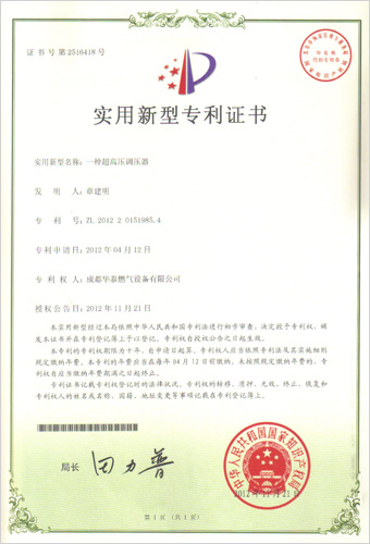 我公司于2012年11月取得调压器、调压箱等八项专利证书